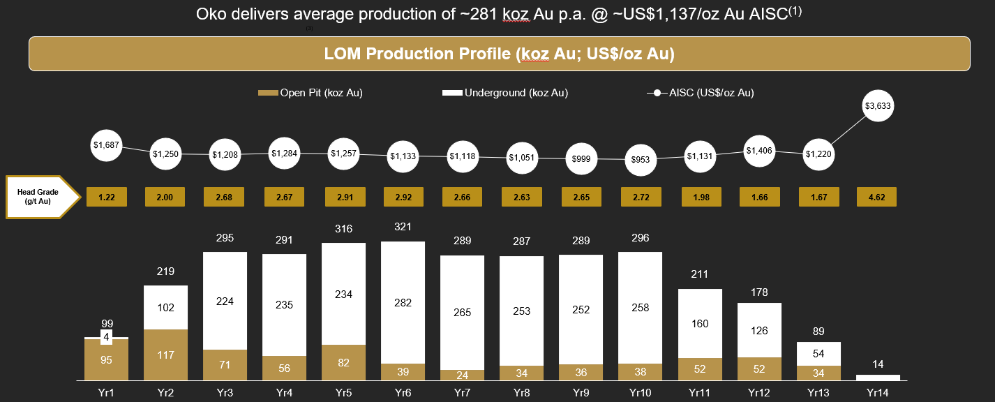 The PEA is based on the updated MRE presented totalling 1.6 million ounces of gold (Indicated) and 1.9 million ounces of gold (Inferred) from five deposits: Oko Main Zone (“OMZ”), Ghanie, Northwest Oko (“Oko NW”), North Oko (“Oko N”) and the New Oko Discovery. The bulk of the gold mineralization lies along a prominent 2.5 km long north-south structure comprised of the high-grade OMZ deposit and a bulk mineable, disseminated mineral resource at Ghanie. Importantly, OMZ includes high-grade UG Indicated mineral resources of 741,600 ounces at 13.63 grams per tonne gold (“g/t Au”) and 522,100 ounces at 6.77 g/t Au. The New Oko Discovery lies approximately 8.5 km to the north of these deposits and was only discovered in March 2025.